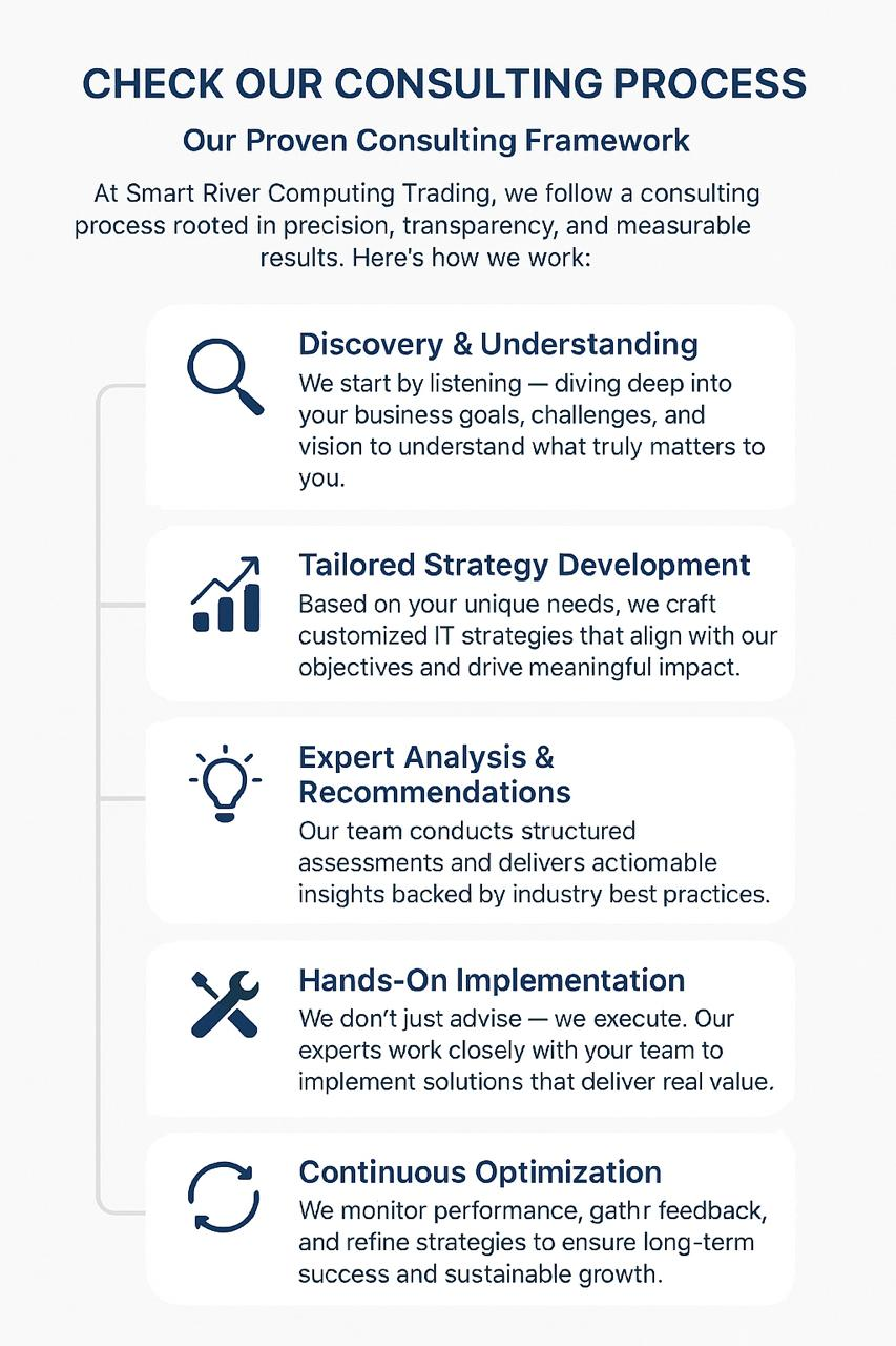 At Smart River Computing Trading, our consulting process is built on precision, transparency, and measurable outcomes. We begin by understanding your unique business challenges and goals, then craft tailored IT strategies that align with your vision. Through structured analysis, expert recommendations, and hands-on implementation, we ensure every solution delivers real value. Our process is collaborative, data-driven, and focused on long-term success — helping you make confident decisions and achieve sustainable growth.